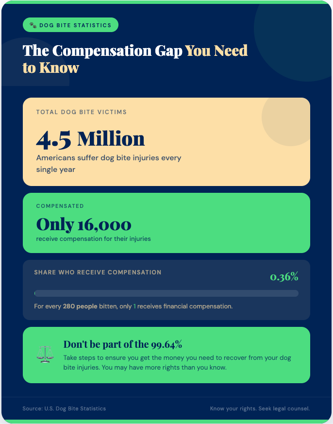 Although almost 4.5 million Americans suffer dog bites every year, only about 16,000 of those victims will receive compensation for their injuries. Take steps to make sure you get the money you need to recover from your dog bite injuries.
